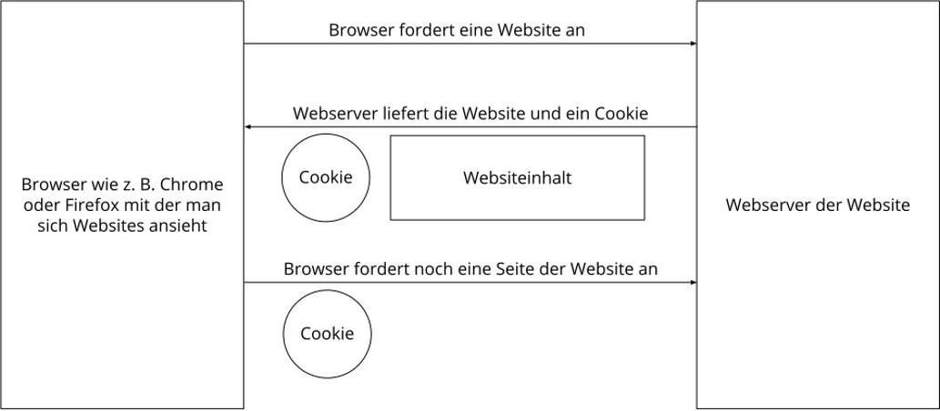 Die folgende Grafik zeigt eine mögliche Interaktion zwischen einem Webbrowser wie z. B. Chrome und dem Webserver. Dabei fordert der Webbrowser eine Website an und erhält vom Server ein Cookie zurück, welches der Browser erneut verwendet, sobald eine andere Seite angefordert wird.